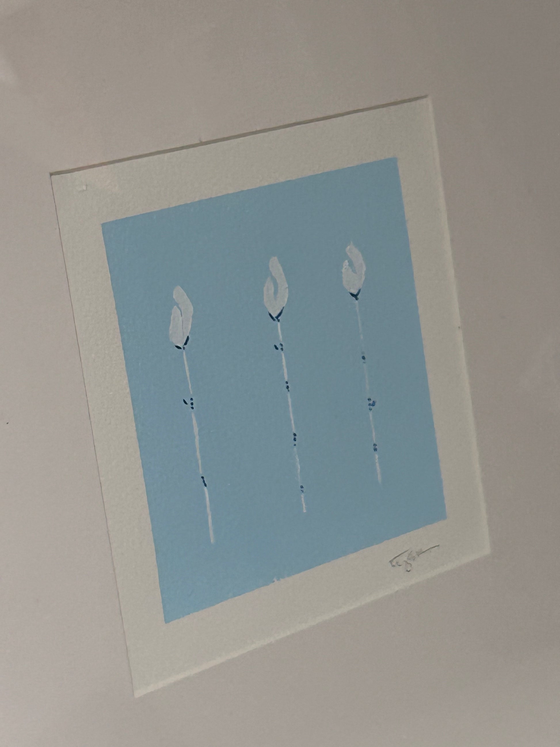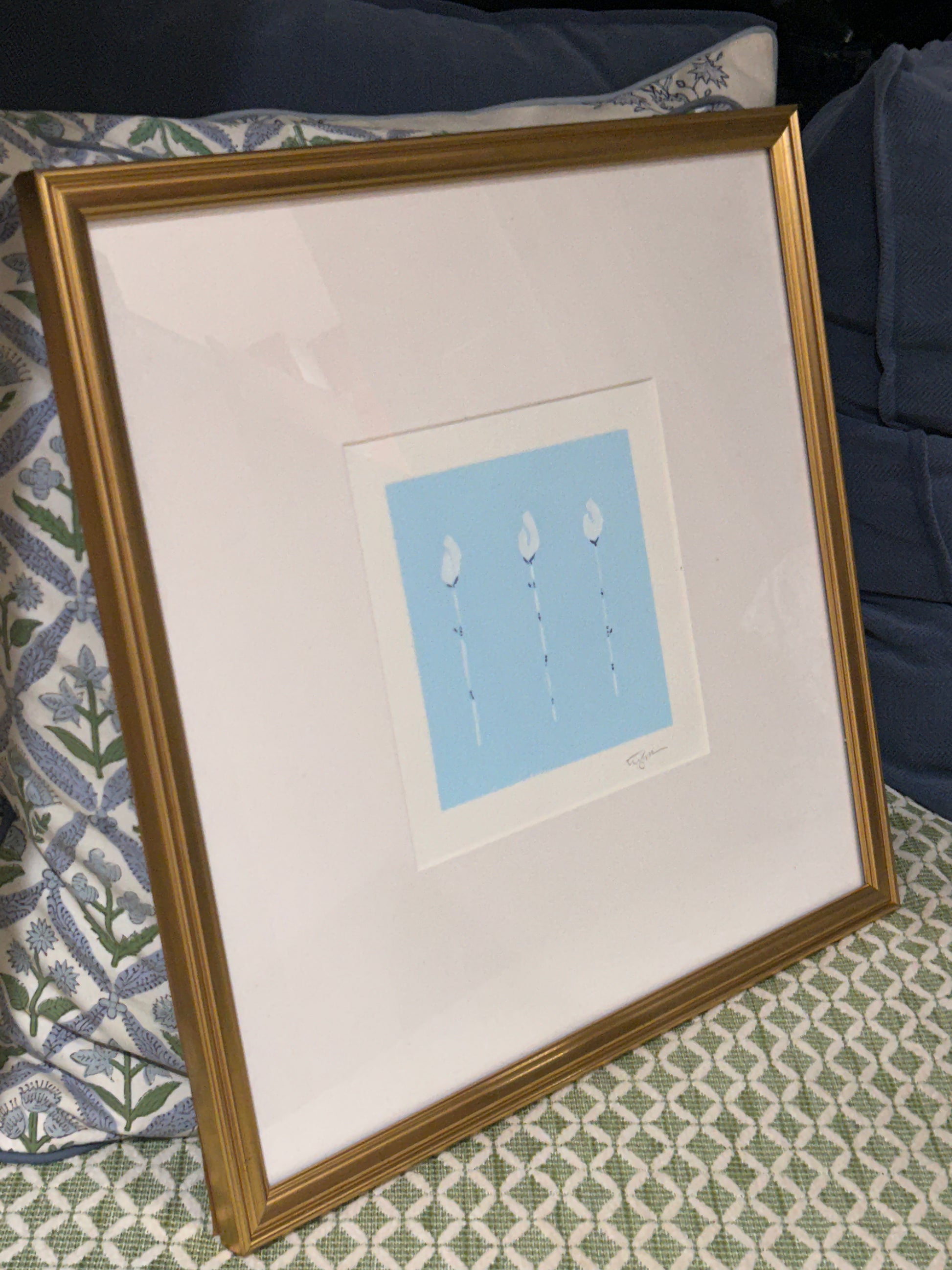 Acrylic on deckle edge matted paper in 16"x16" thin gold frame