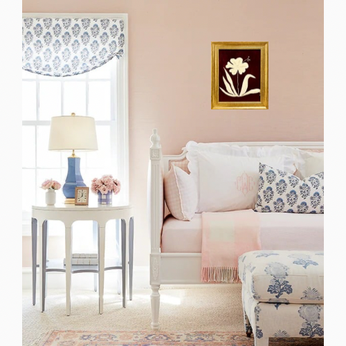 Cream flower with gold details on a maroon backdrop. Acrylic on canvas, 8"x10" framed