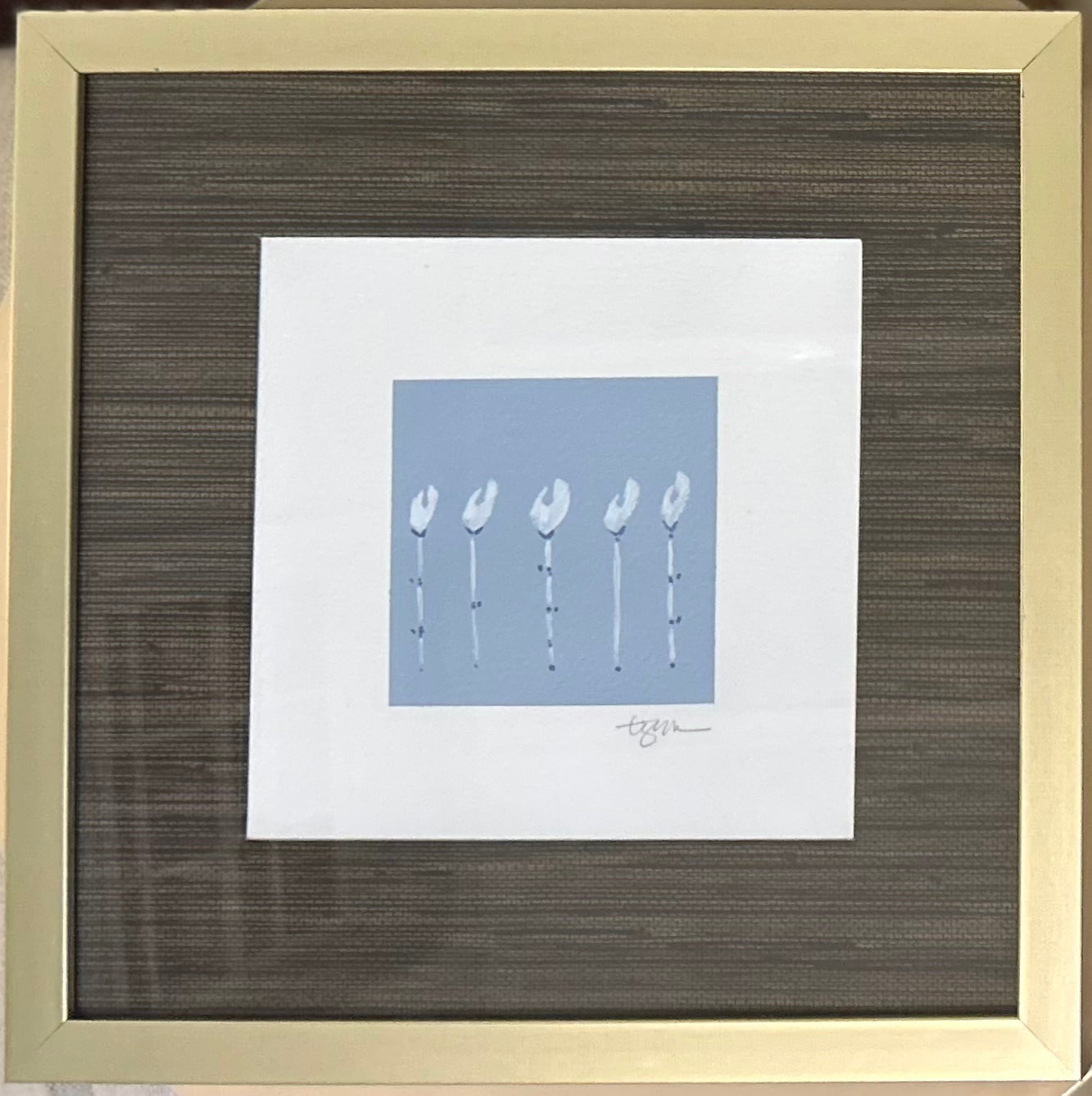 Acrylic on deckle edge paper with grasscloth matting in gold 12"x12" frame