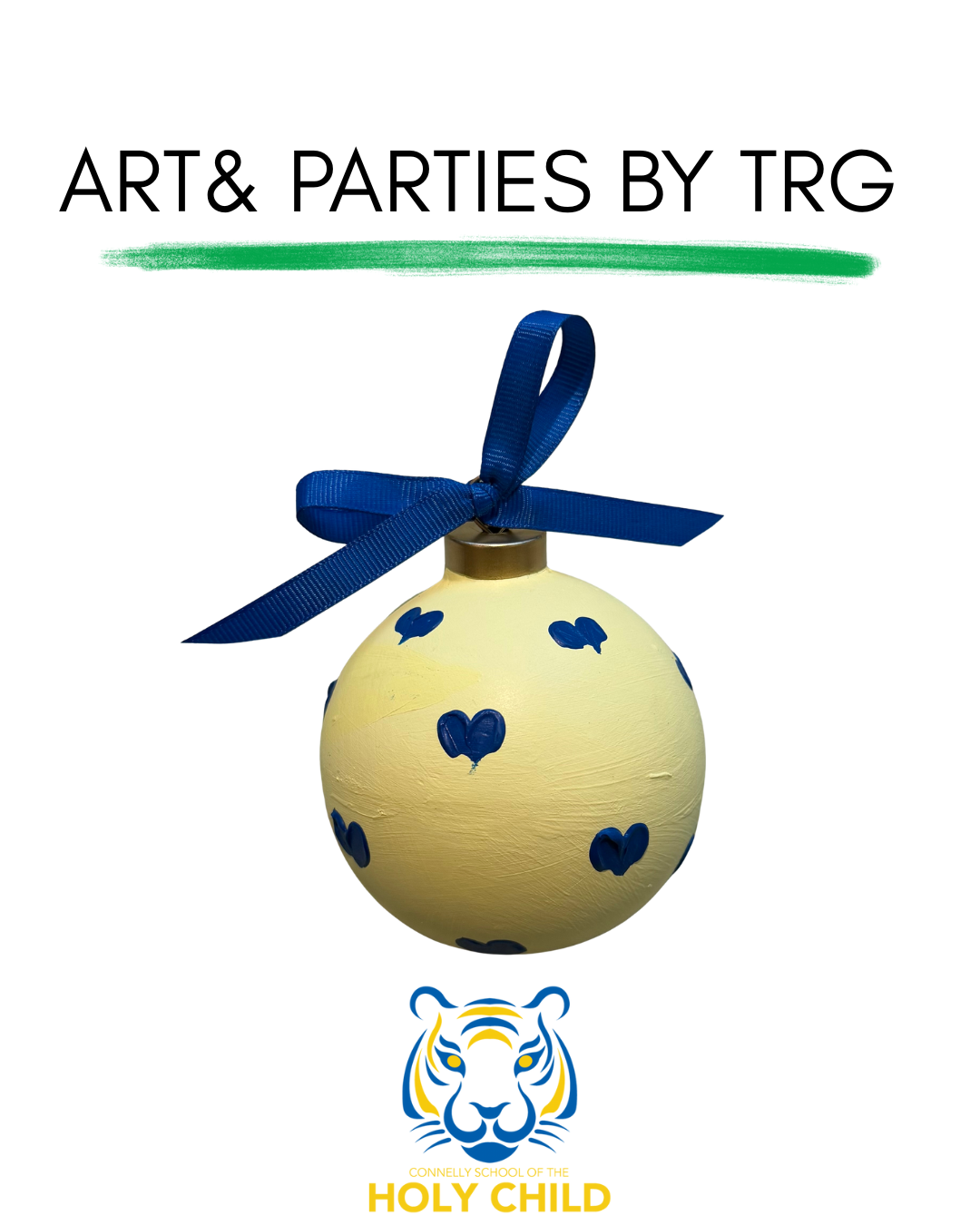 Holy Child school spirit ornaments are hand painted on 3.5" bisque ceramic ornaments with a matte varnish and come tied with a signature TRG school spirit grosgrain bow.