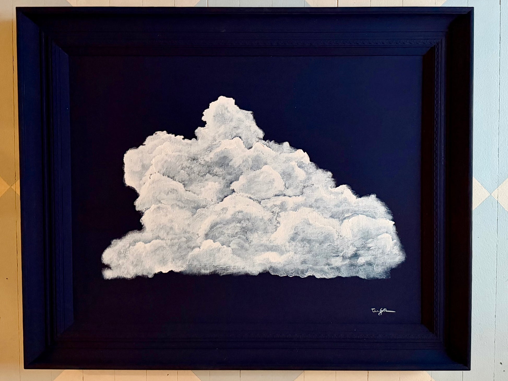 Acrylic and vinyl on canvas; measures 24"x30" framed in custom color matched navy frame